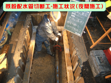 国道41号線の歩道箇所を布設替えする際に、歩車道ブロックの真下に既設管が布設されていた為、土留支保工が難しい状態であったため、毎日の施工に併せて歩車道ブロックを外し施工を行い、確実な土留めを心がけた。